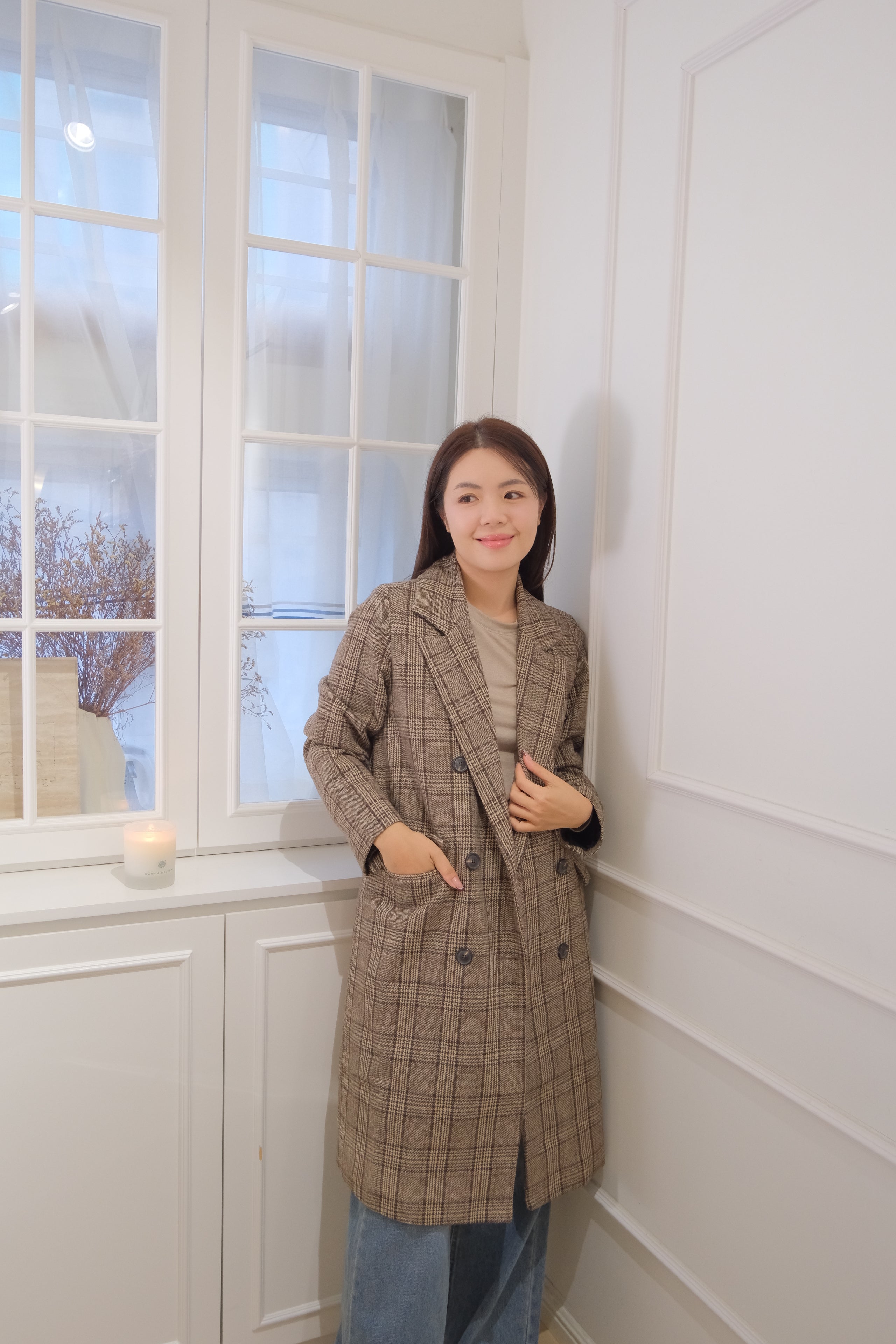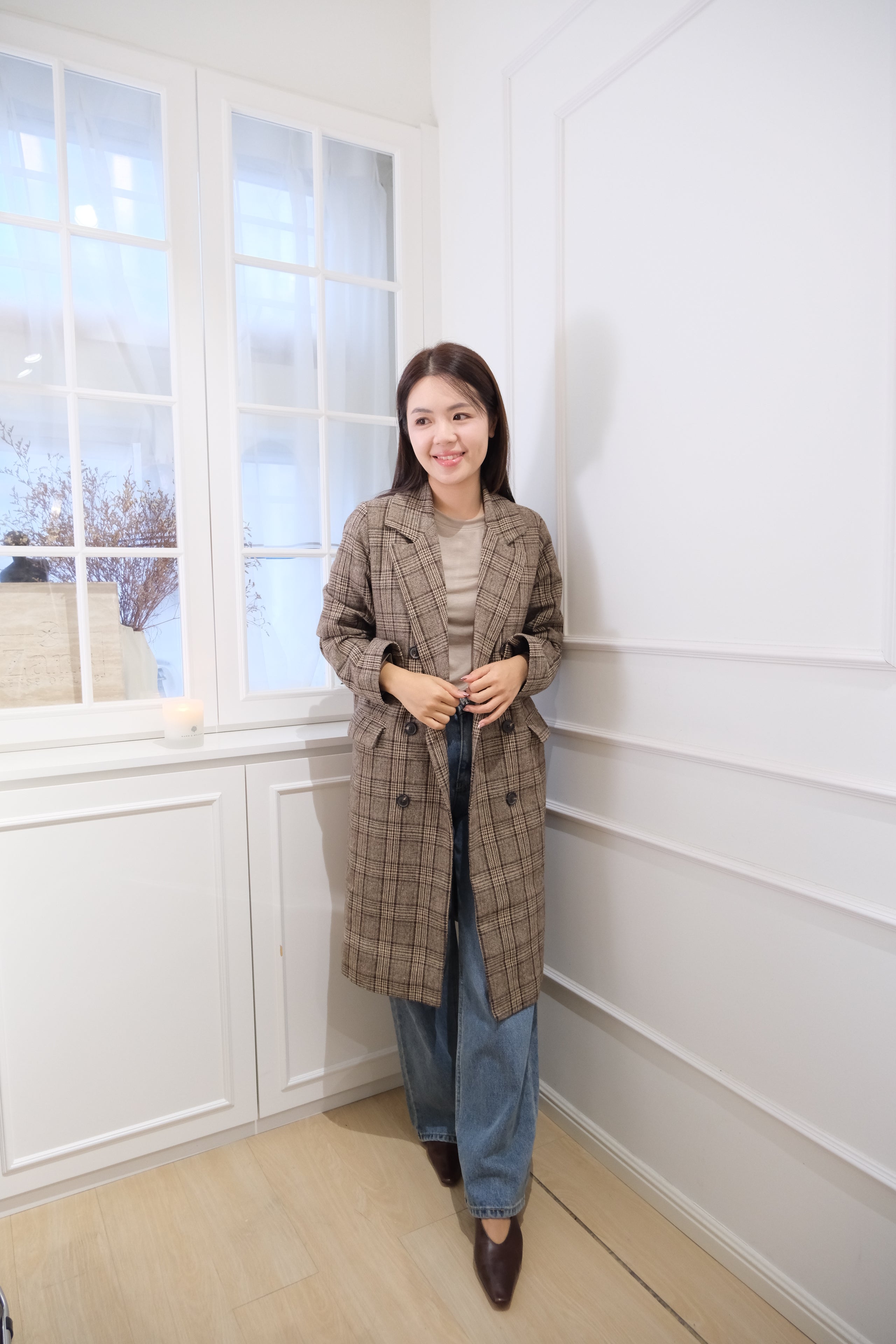 Plaid Long Double-Breasted Trench Coat [J0132]