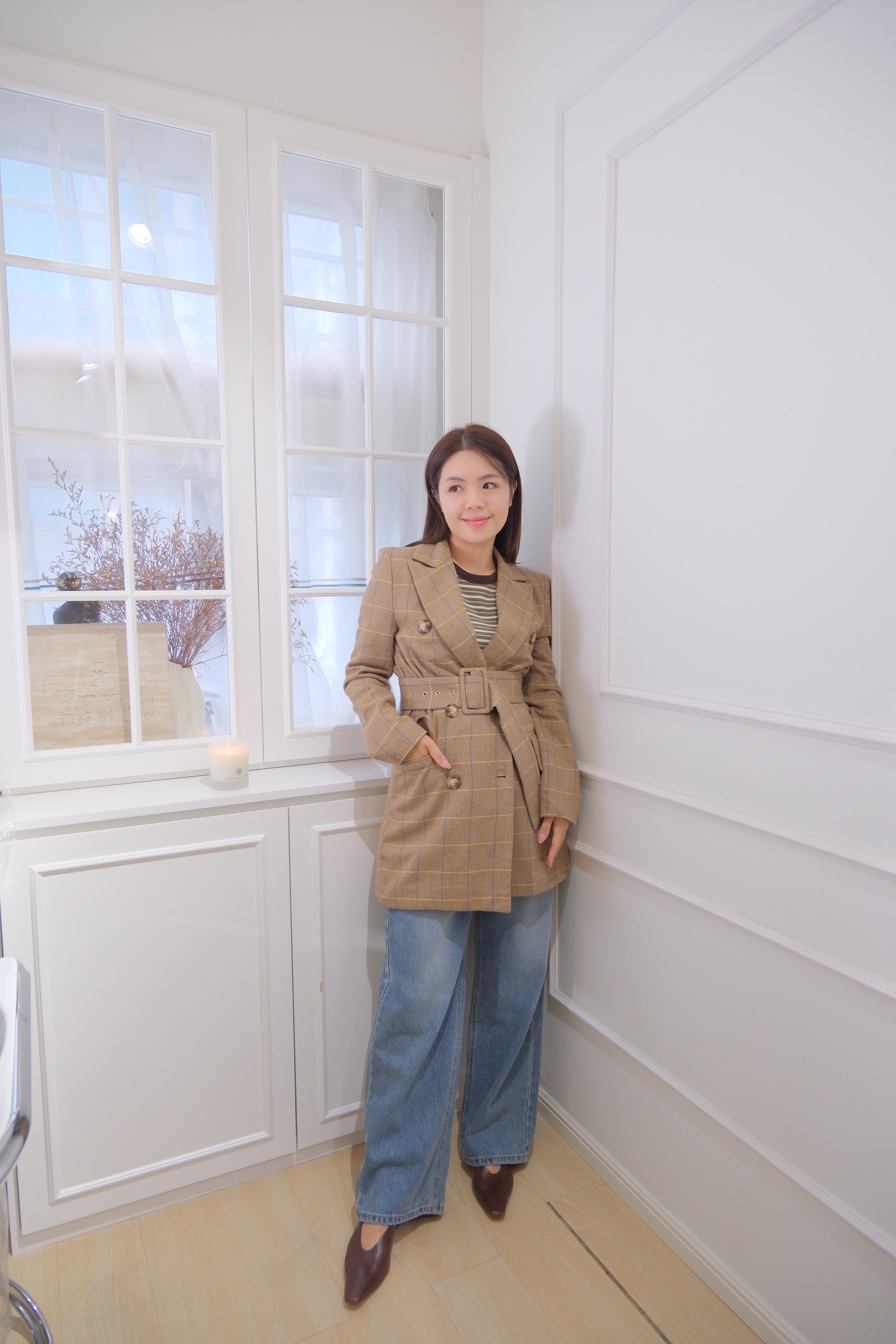 Plaid Double-Breasted Belted Trench Coat [J0131]